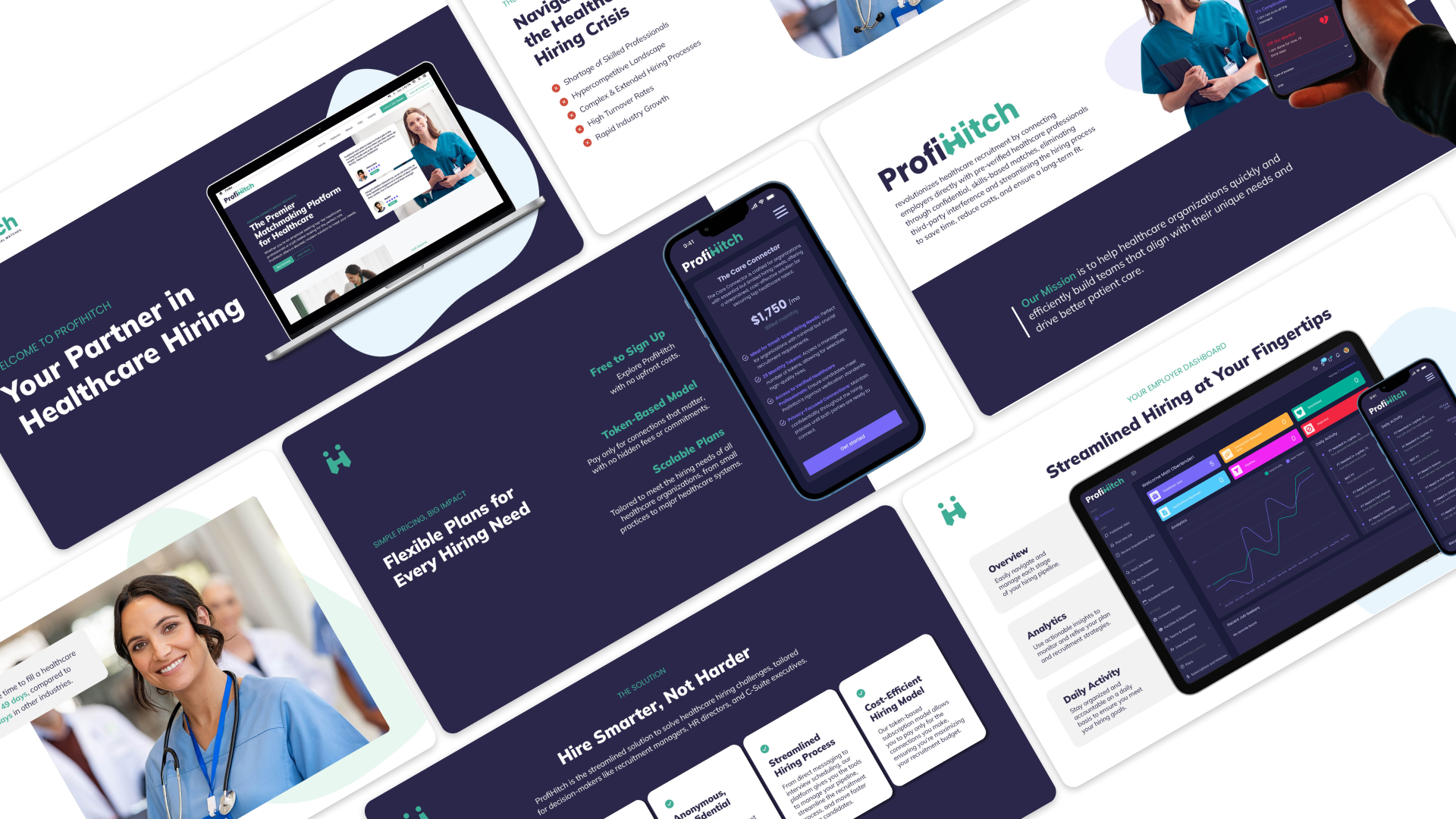 ProfiHitch is a platform that connects healthcare professionals with employers through AI-powered matching. I lead the creative production across all projects, guiding work from concept to delivery while also working hands-on to design print and digital materials, pitch decks, social media graphics, digital ads, and email campaigns. My role focuses on shaping the brand’s visual identity and making sure every deliverable feels cohesive, polished, and on-brand.